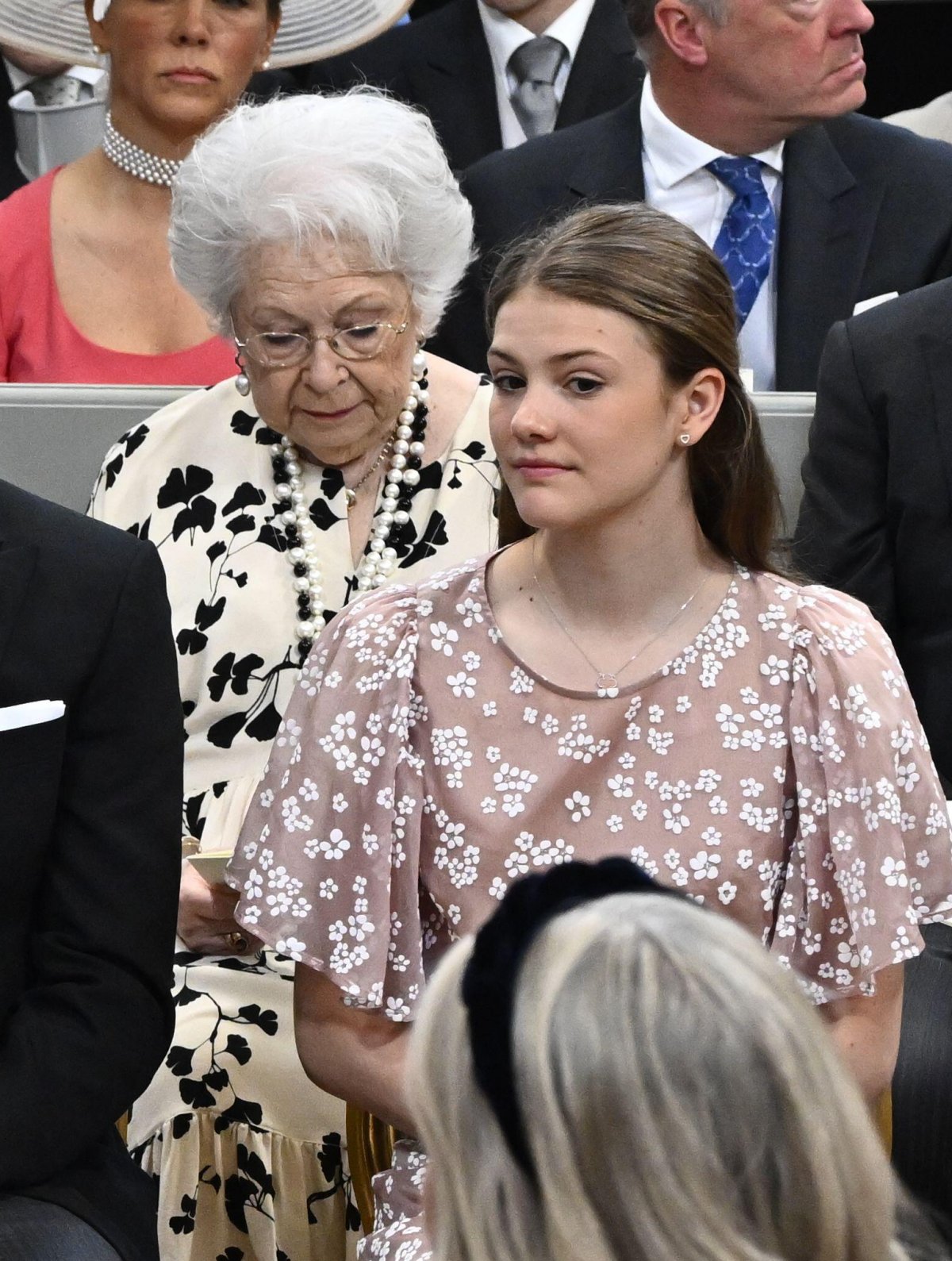 Thirteen-year-old Princess Estelle played an important role during Friday’s service, but her clothing and jewelry was still age appropriate. She wore a blush-colored dress with a petite white floral print, paired with heart-shaped diamond earrings and a necklace with a small pendant. In some photographs, the pendant peeks out, and it appears to me to be a small Van Cleef & Arpels piece.