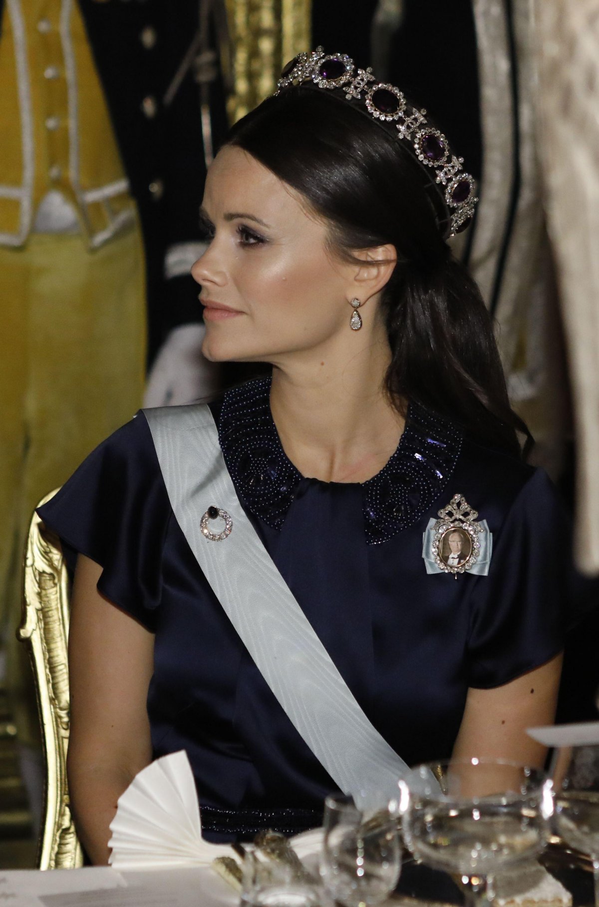 Princess Sofia tried out a more substantial Swedish royal tiara for a banquet in honor of the Governor General of Canada at the Royal Palace a few months later, wearing the Napoleonic Amethyst Tiara. The jewel, which was originally a large necklace, is part of an extensive parure of diamond and amethyst jewels that comes from the Leuchtenberg family. Queen Silvia made the suite a complete parure by setting the necklace as a circlet on a frame.