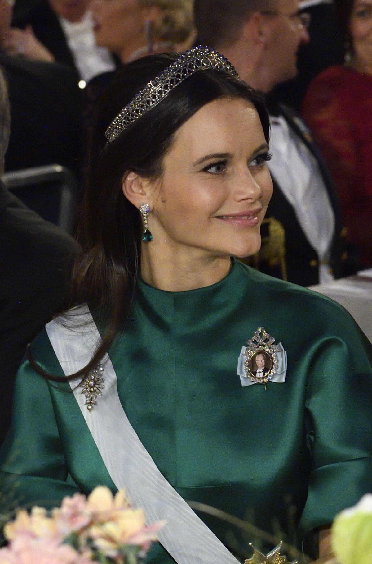 The following evening, for the King’s Dinner for the Nobel laureates at the Royal Palace, Princess Sofia made her first public appearance in the Diamond Four-Button Tiara. The tiara was made in the middle of the twentieth century to provide an additional option for the King’s four sisters to wear for gala occasions. To make the piece, four antique diamond buttons from the family collection were placed on a simple, sleek tiara frame.