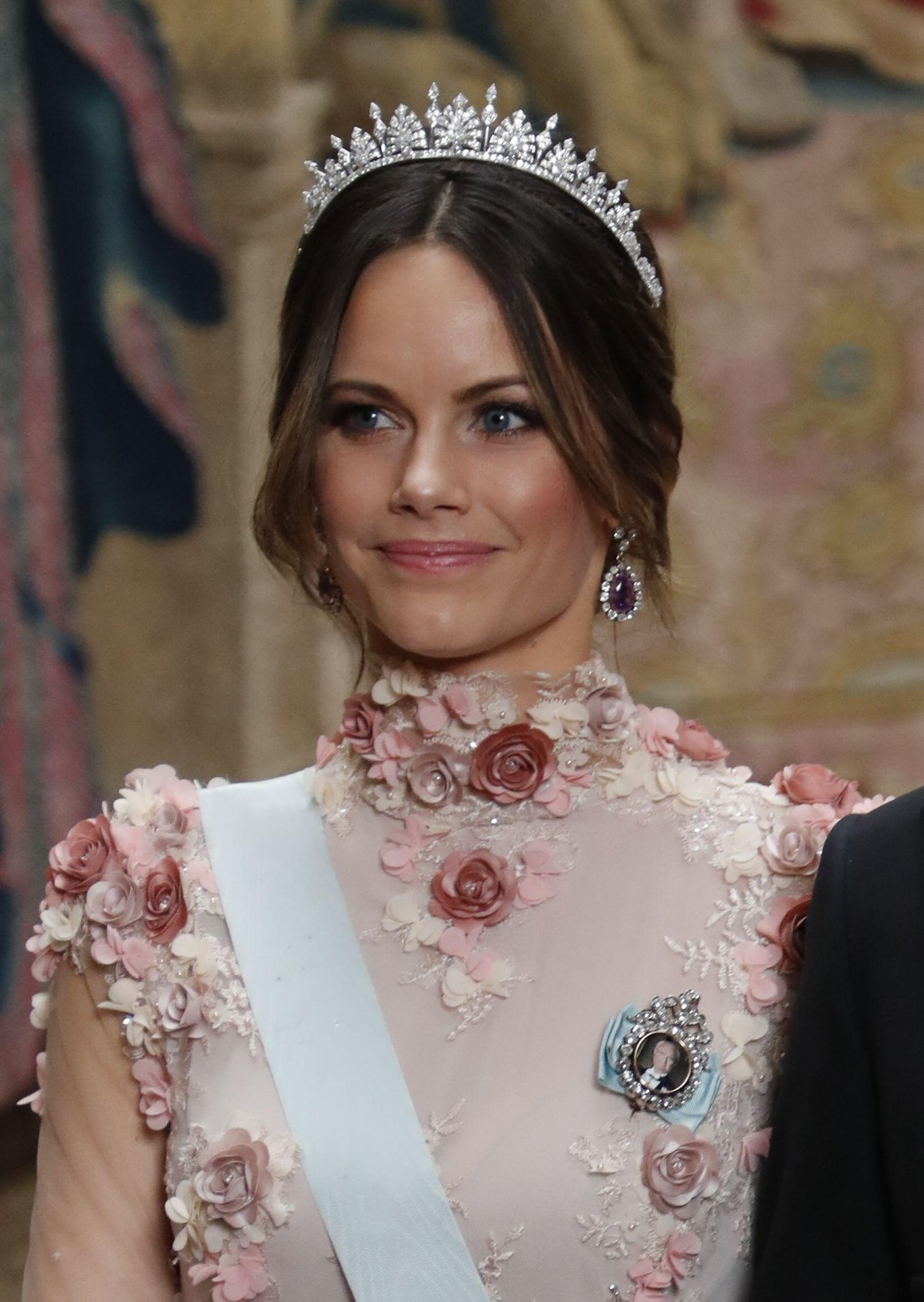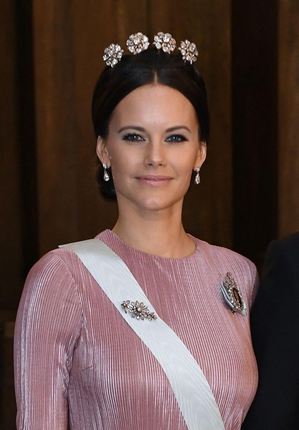 By the autumn of 2017, the renovations to Sofia’s wedding tiara had been completed. The diamond palmette tiara arrived back in Stockholm with a fresh new shape. The previously-rigid tiara had been opened up so that it formed more of a halo around Sofia’s face.