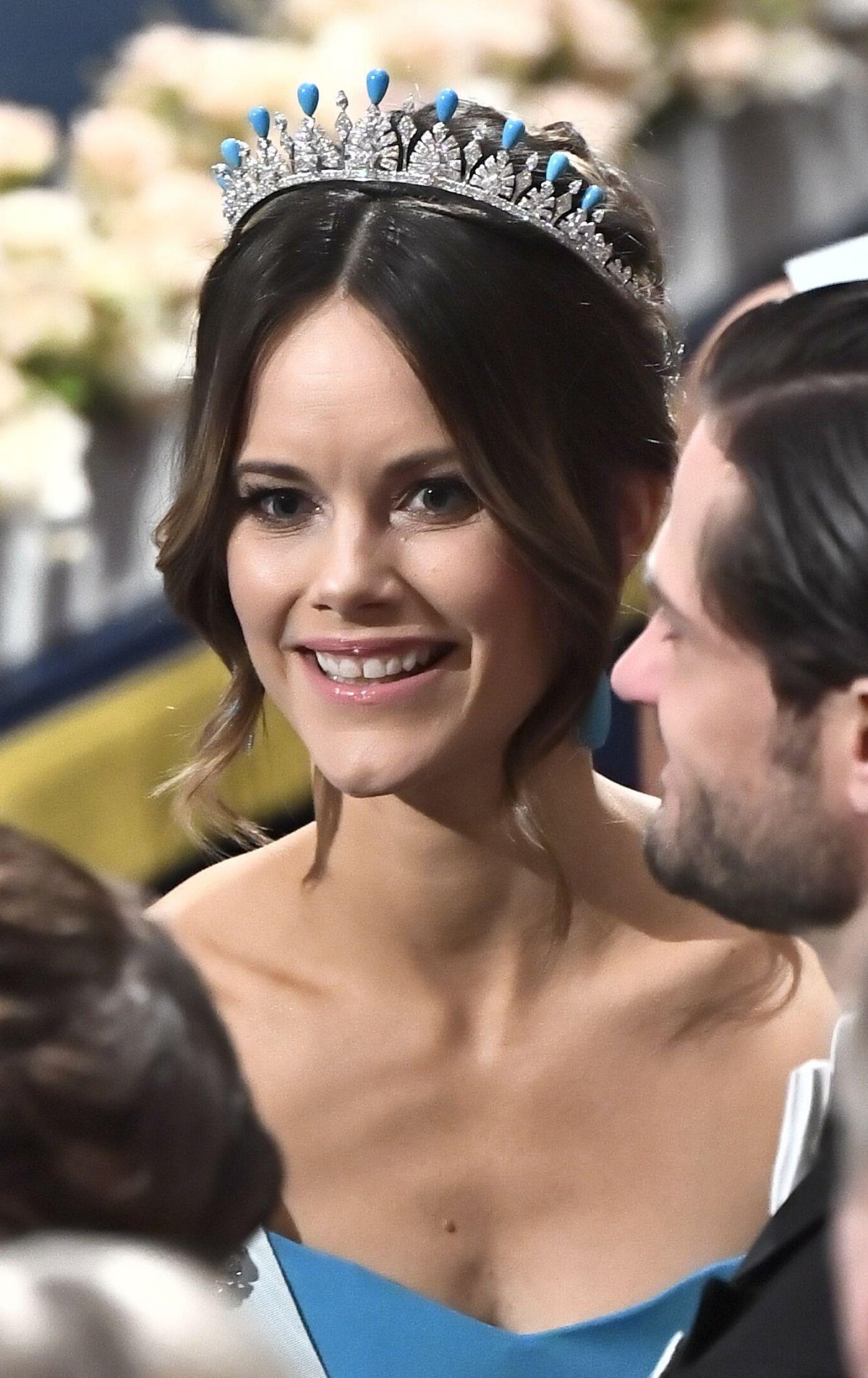 Over the past several years, Sofia has frequently delighted us by adding new gemstone toppers to her tiara, creating a rainbow of possibilities for coordinating the tiara with jewelry, gowns, and decorations. In December 2019, she debuted a new set of turquoise toppers for the tiara at the Nobel Prize ceremony and banquet.