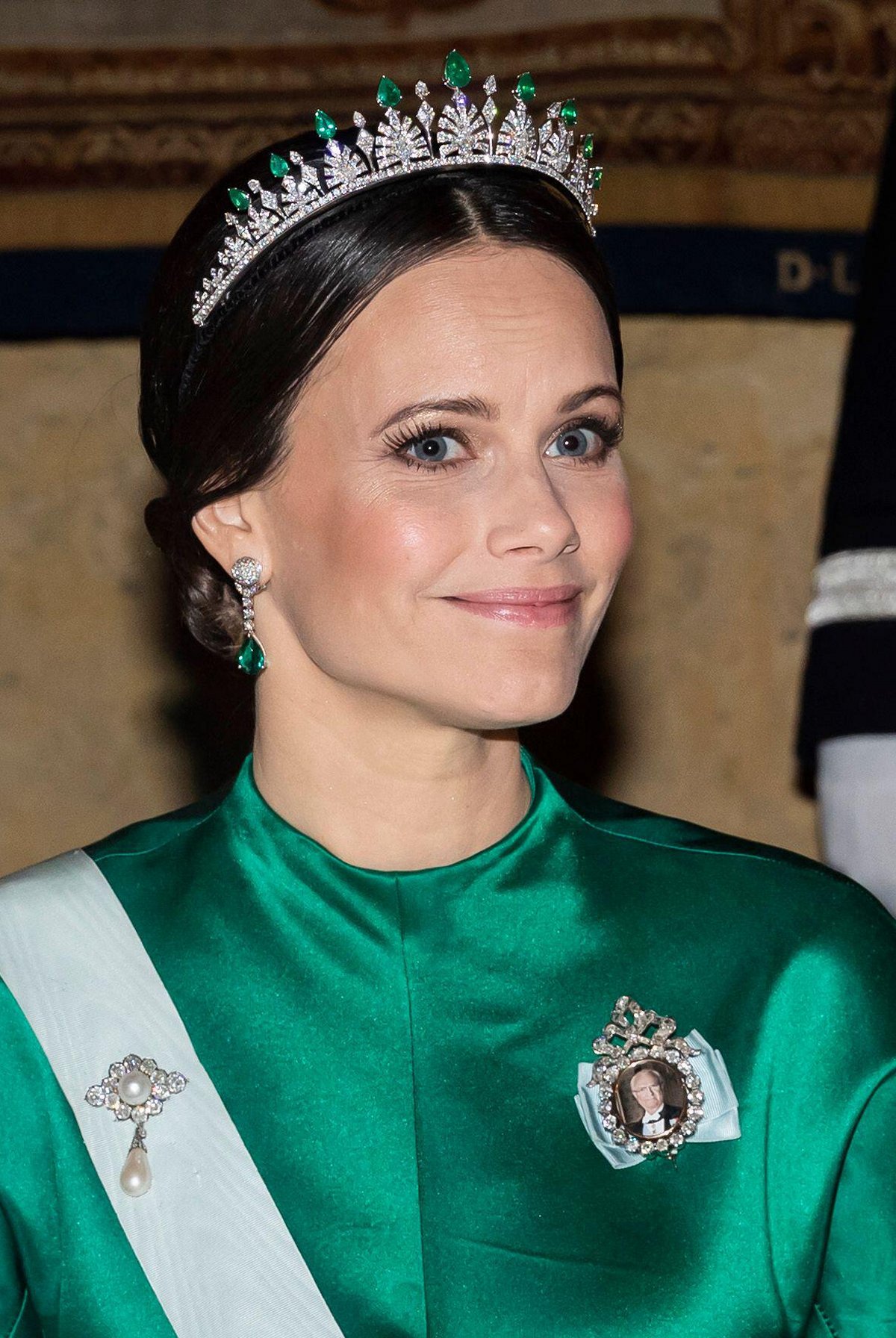 With a wedding gown and veil made by the Swedish designer Ida Sjöstedt, Sofia wore a pair of diamond earrings from the royal vaults and a special new tiara. The tiara featured diamond palmette leaf designs topped with pear-shaped emeralds, all set on a thin diamond band curved into a coronet-like shape. It was a wedding gift from her new parents-in-law, King Carl XVI Gustaf and Queen Silvia.