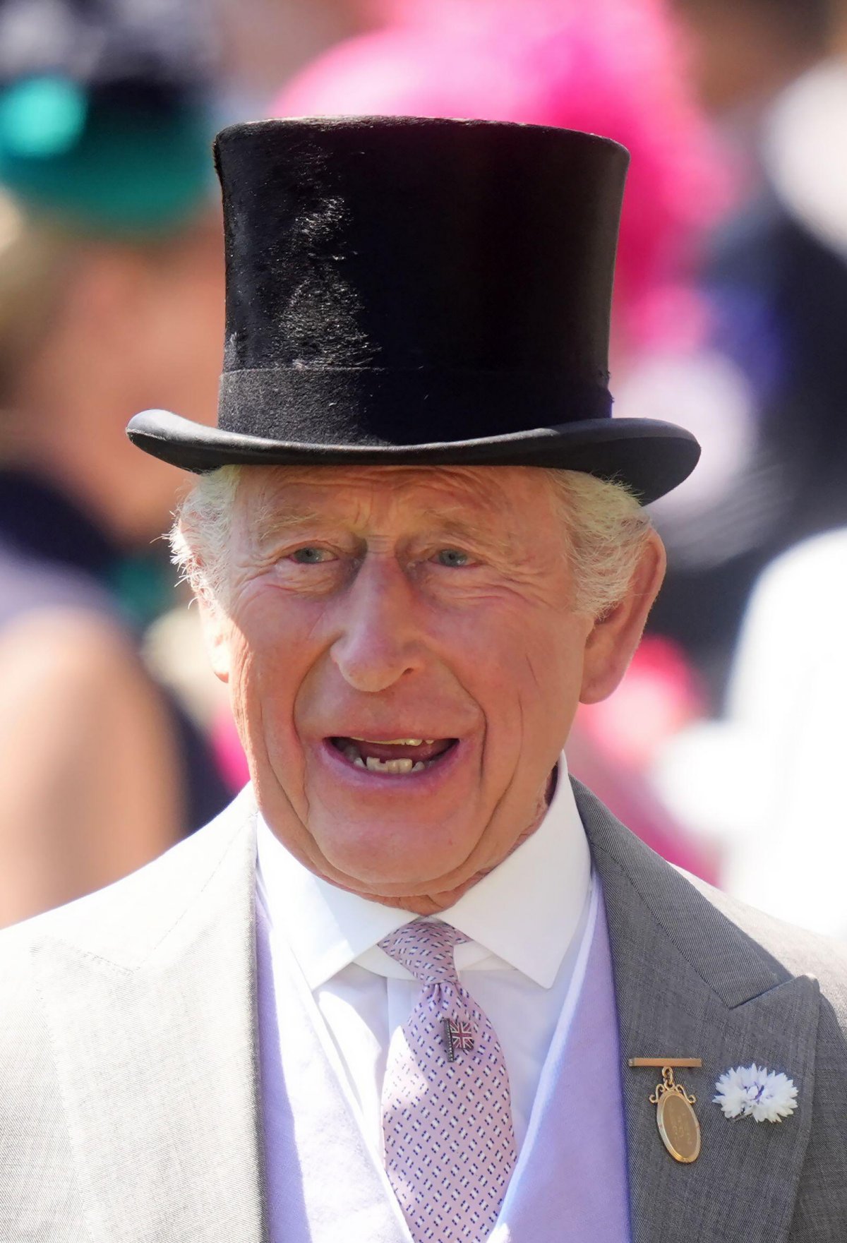 The King’s tie pin choice for the second day of the race meeting was a playful one: a little gem-set Union Jack, worn on a pink patterned tie.