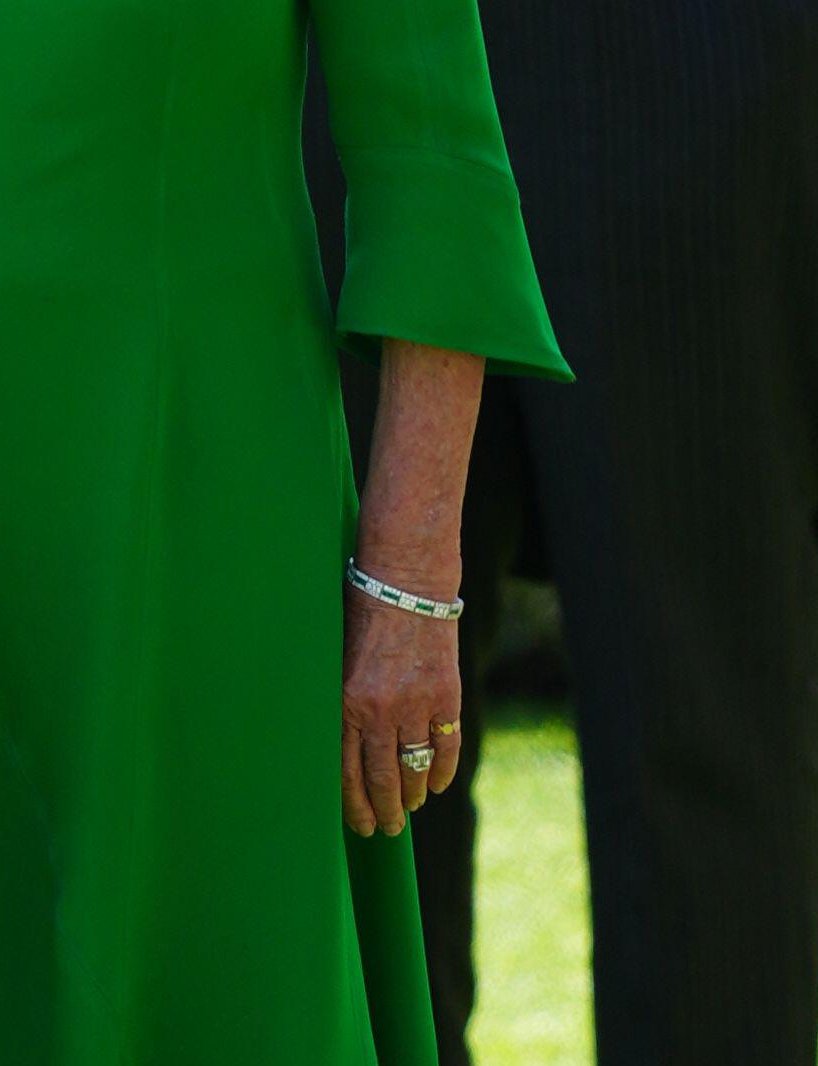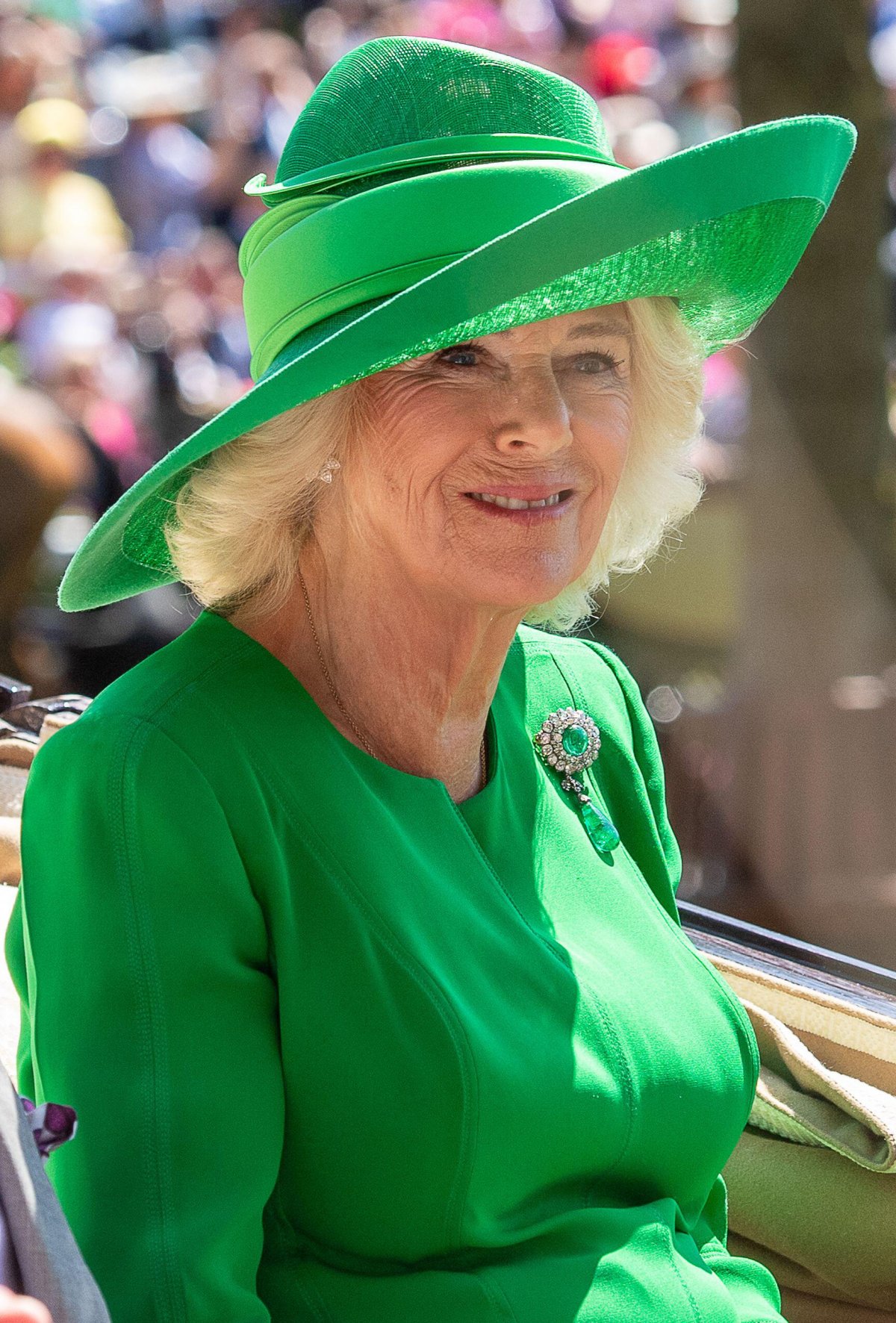 Camilla also snuck one more piece of royal heirloom jewelry into her ensemble: a Cartier diamond and emerald bracelet that belonged to Queen Elizabeth the Queen Mother. The Art Deco bracelet is part of a set of five, three of which can be worn together on a tiara frame, and Camilla has now been spotted in all of the different colorful options (diamonds, sapphires, rubies, and emeralds).