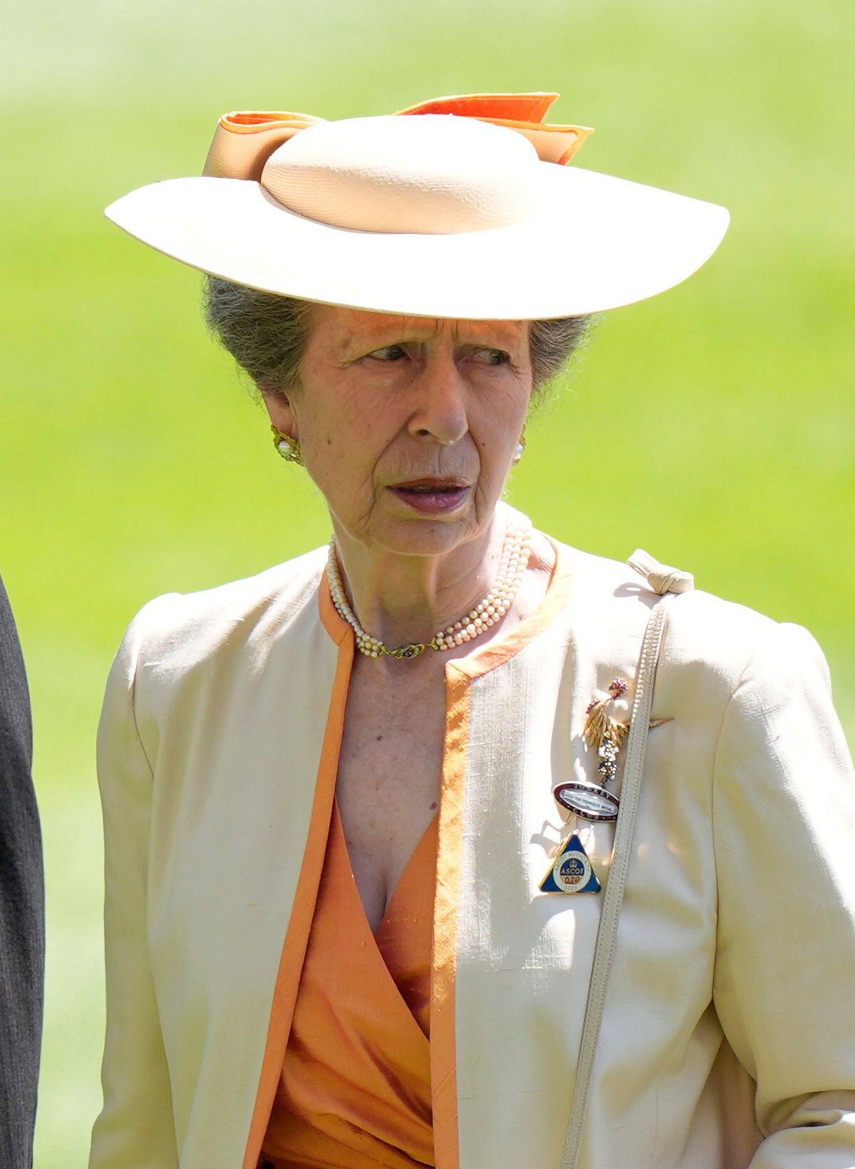 The Princess Royal wore classic jewels from her collection for the second day of the race meeting: her Andrew Grima pearl, diamond, and gold earrings, paired with her three-row seed pearl choker and a bejeweled bird brooch.