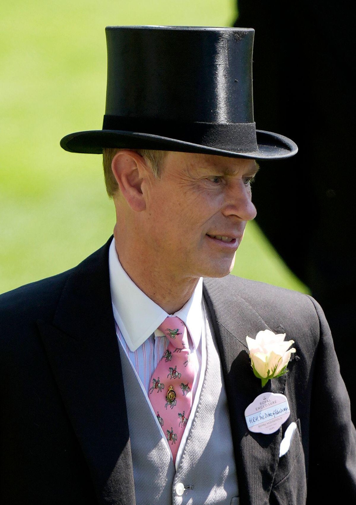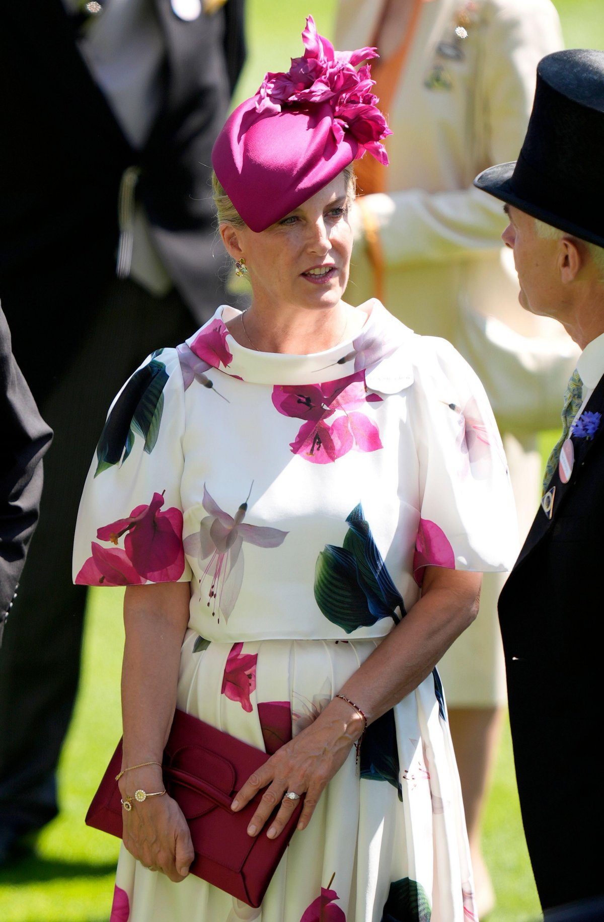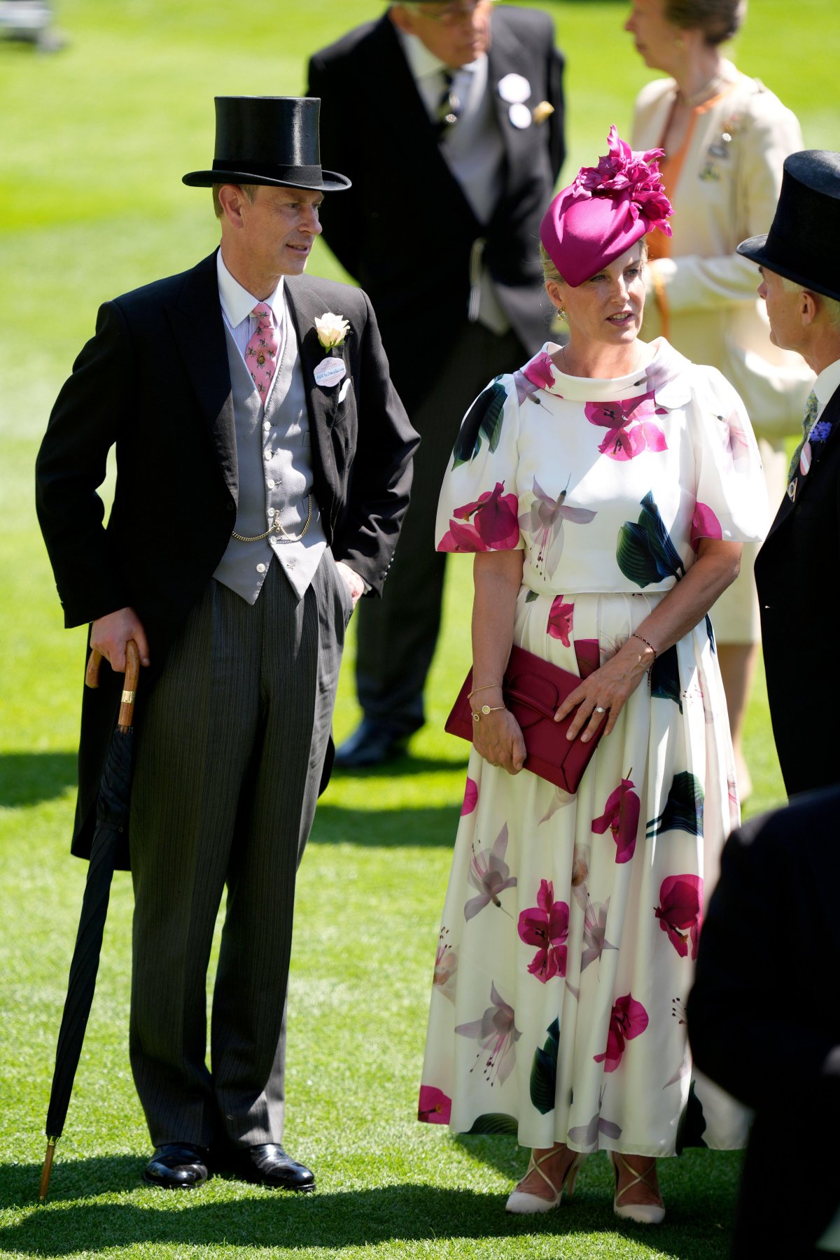 And here’s a look at the Duke and Duchess of Edinburgh in the Royal Enclosure ahead of the start of the races on Wednesday, with Sophie wearing a bright, colorful floral dress with a pink hat.