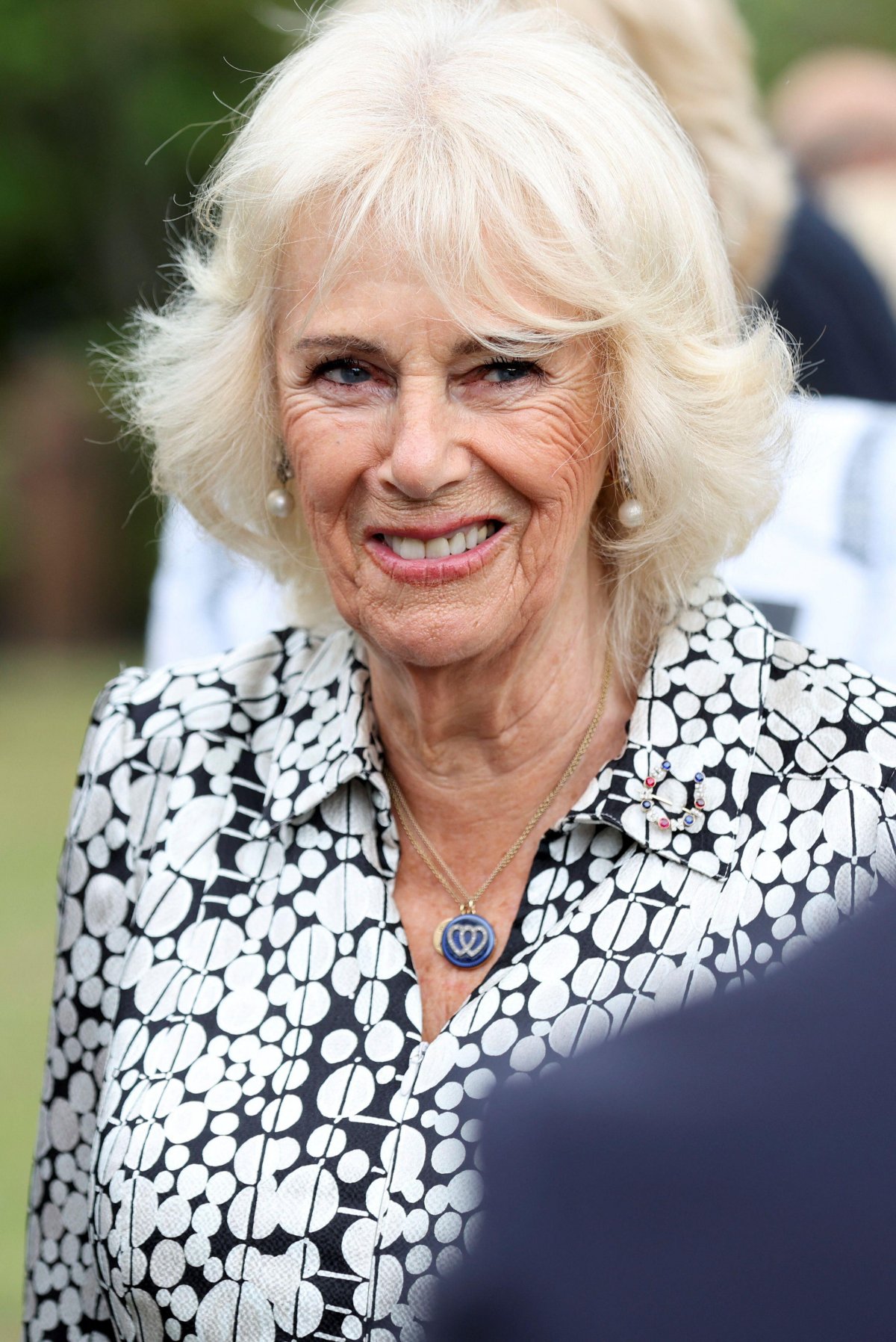 Queen Camilla wore a black and white printed summer dress for the daytime outing, paired with neutral accessories and several interesting pieces of jewelry.