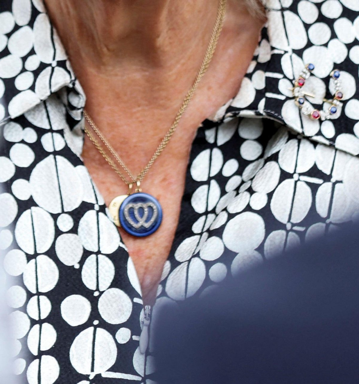 Along with some of her staple pieces, including her diamond floral and pearl drop earrings and her Van Cleef & Arpels blue agate Alhambra bracelet, Camilla wore a pair of necklaces and a familiar brooch. The necklaces featured a pair of pendants, one engraved with the initials of her grandchildren, and the other made of blue enamel and decorated with pavé-set diamonds in an interlocking heart design.