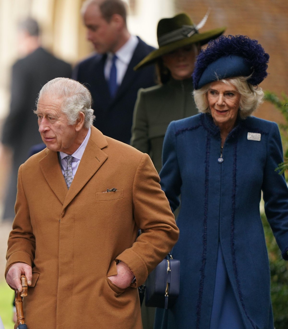 The placement of the pendant made me wonder at the time whether it was a jewel or an embellished zipper pull. (It’s a jewel.) Interestingly, Camilla made a point of showcasing the pendant as the family left the church after the service. She had it tucked away in her coat during the walk from Sandringham to St. Mary Magdalene beforehand.