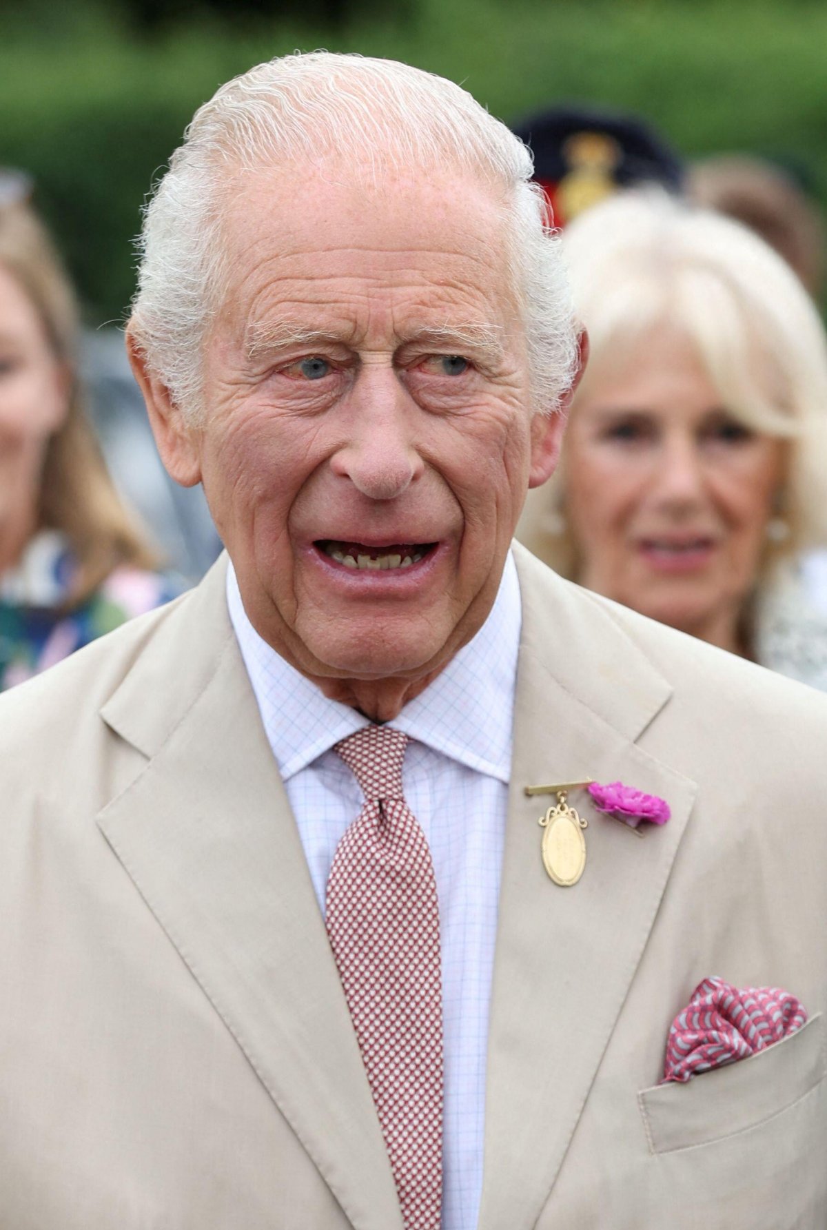 Queen Camilla has been wearing the brooch for many years, dating back to her days as Duchess of Cornwall. The brooch features diamond letters spelling out MINORU, interspersed with sapphires and rubies representing the royal racing colors. Camilla most often wears the jewel at events related to horses or racing.