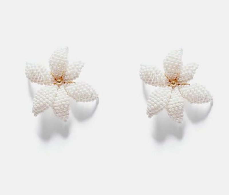 Here’s a closer look at the earrings from the Carolina Herrera website. The petals of the gold plated flower earrings are decorated with small white beads.