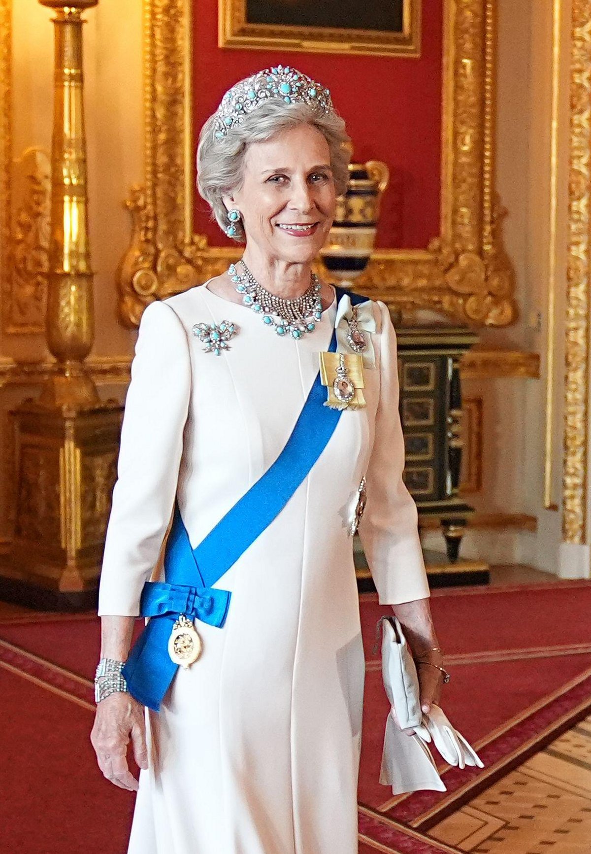 The Princess Royal, fresh off a trip to Belgium, wore several favorite pieces of gala jewelry for the banquet, including her diamond festoon tiara and diamond festoon necklace and coordinating earrings. The tiara was a gift from the World-Wide Shipping Group in 1973, when she launched one of their tankers, the World Unicorn, while the necklace and earrings were eighteenth-birthday gifts from her parents, Queen Elizabeth II and Prince Philip.