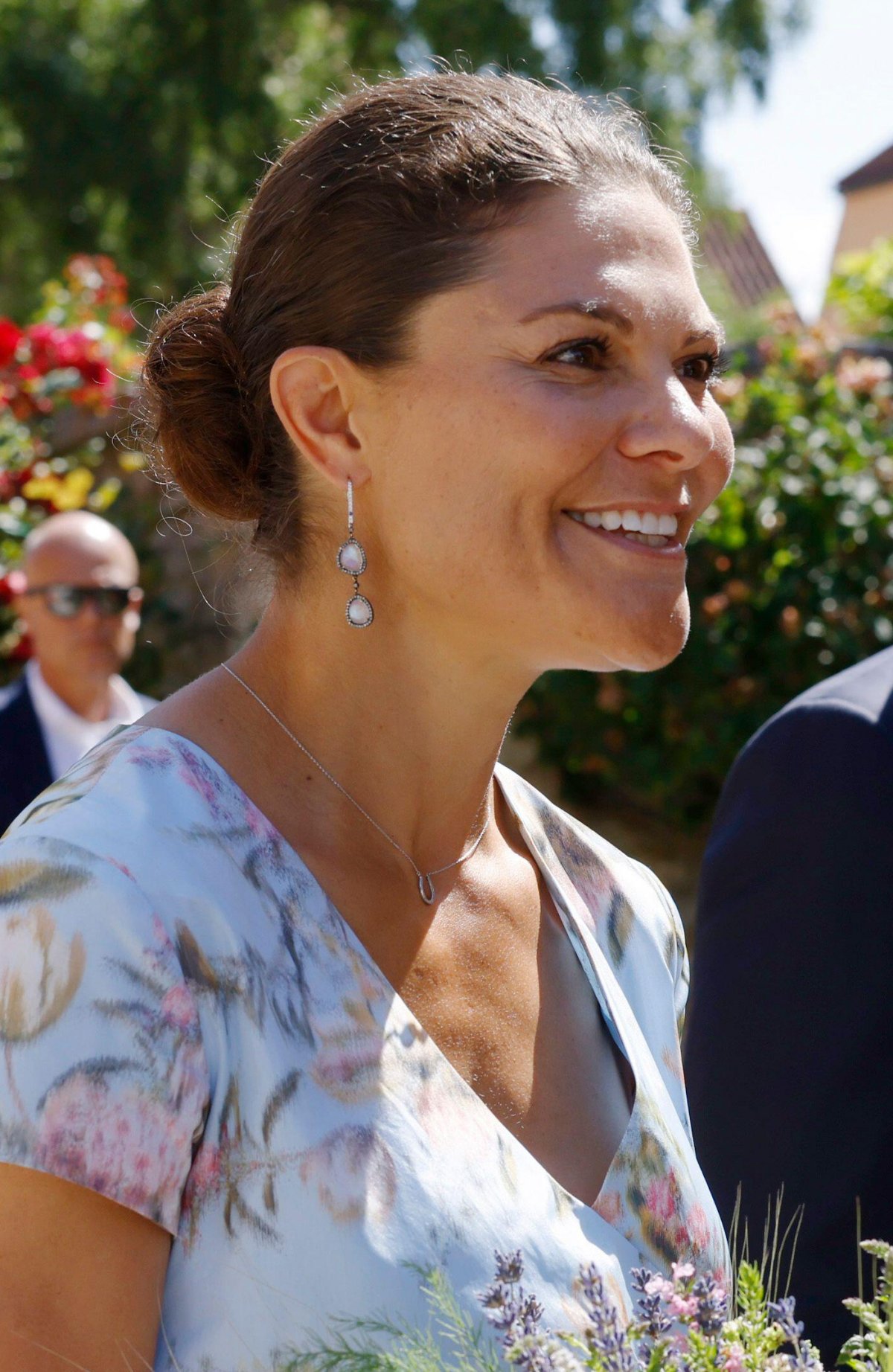 With the dress, Crown Princess Victoria wore several pieces of cool-toned jewelry, including a necklace featuring a diamond horseshoe charm and earrings set with diamonds and moonstones.