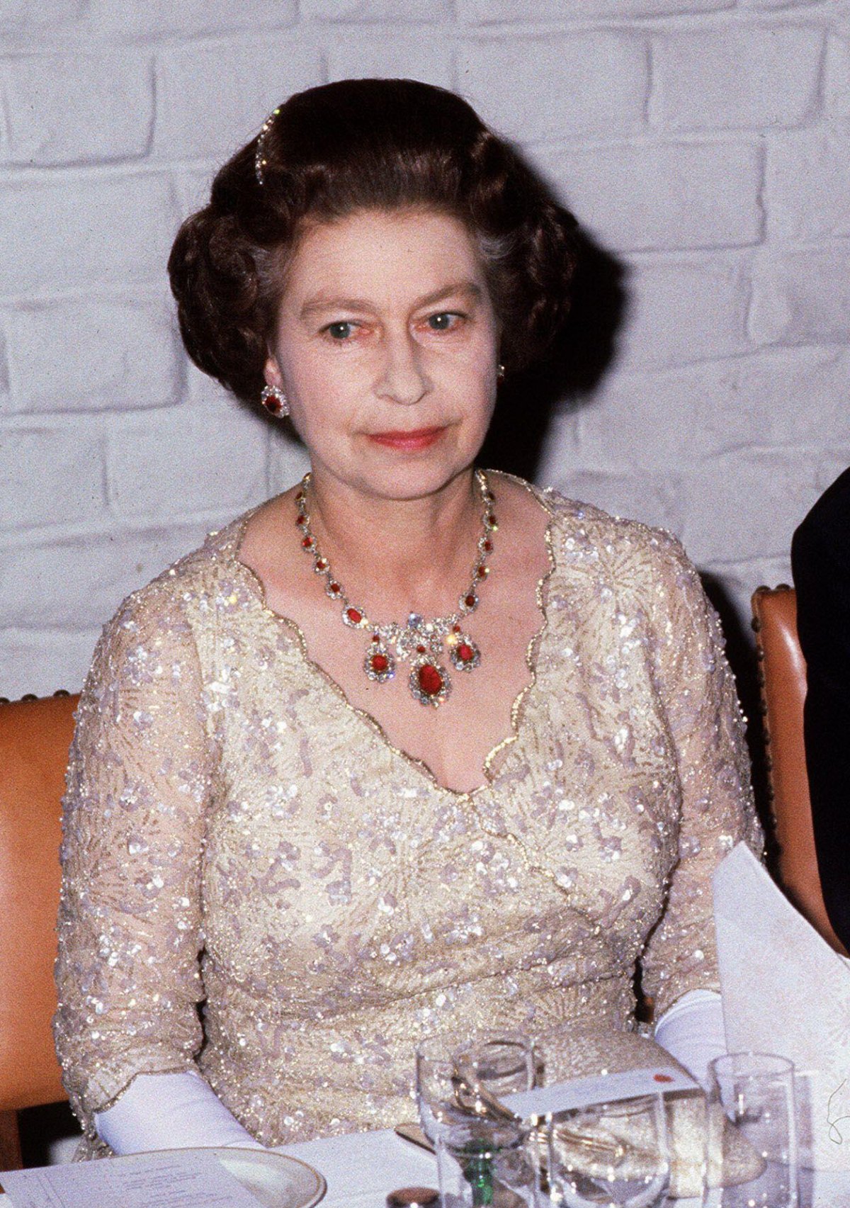 In 1985, the Queen’s ruby collection grew, thanks to a gift from the Emir of Qatar. He offered her a modern demi-parure set with diamonds and cabochon rubies, including a necklace and a matching pair of earrings. So far, she’s the only person who has worn the suite in public.