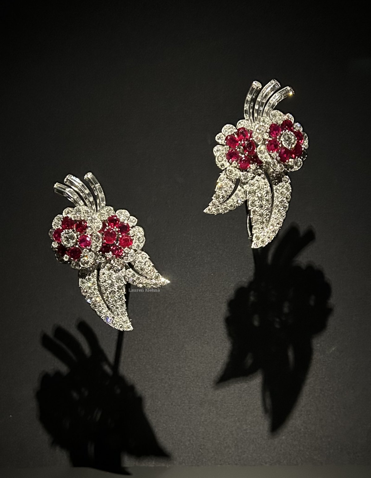 The Queen Mother also owned another special pair of ruby and diamond brooches with a floral design. These clip brooches were made by Cartier and commissioned by Elizabeth herself in the 1940s. She primarily wore them together as a pair, though she sometimes used them as single brooches as well. After inheriting the clips, Queen Elizabeth II usually wore just one at a time. Queen Camilla has demonstrated that she enjoys wearing clip brooches together, and I’m looking forward to seeing her try these out. We’ll all have to wait a bit, though, because the clips are currently dazzling on display at the Victoria & Albert Museum in London as part of the big Cartier exhibition, which runs through November.