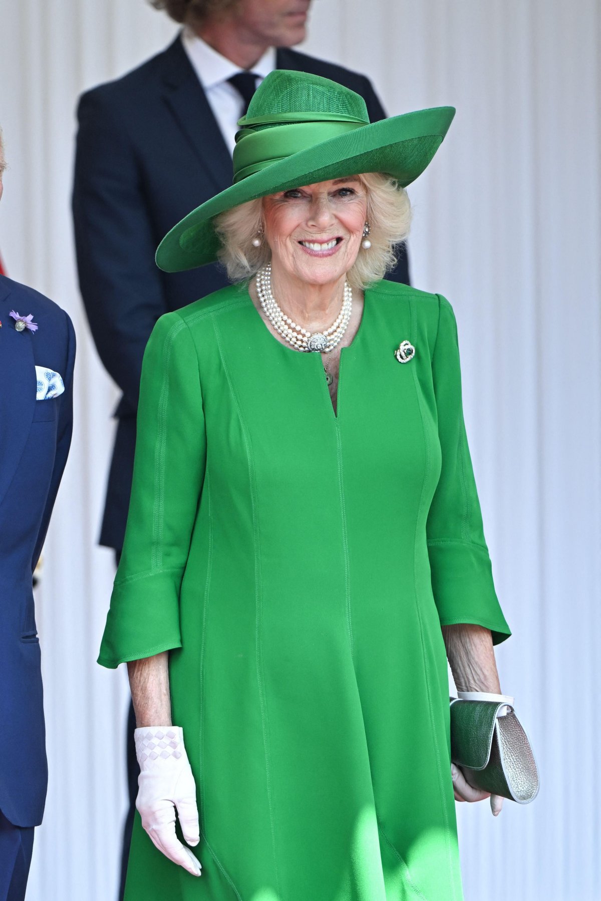 For the welcome ceremony, Queen Camilla wore a favorite dress in a bright shade of green, paired with a matching hat, white gloves, and a silver clutch bag.