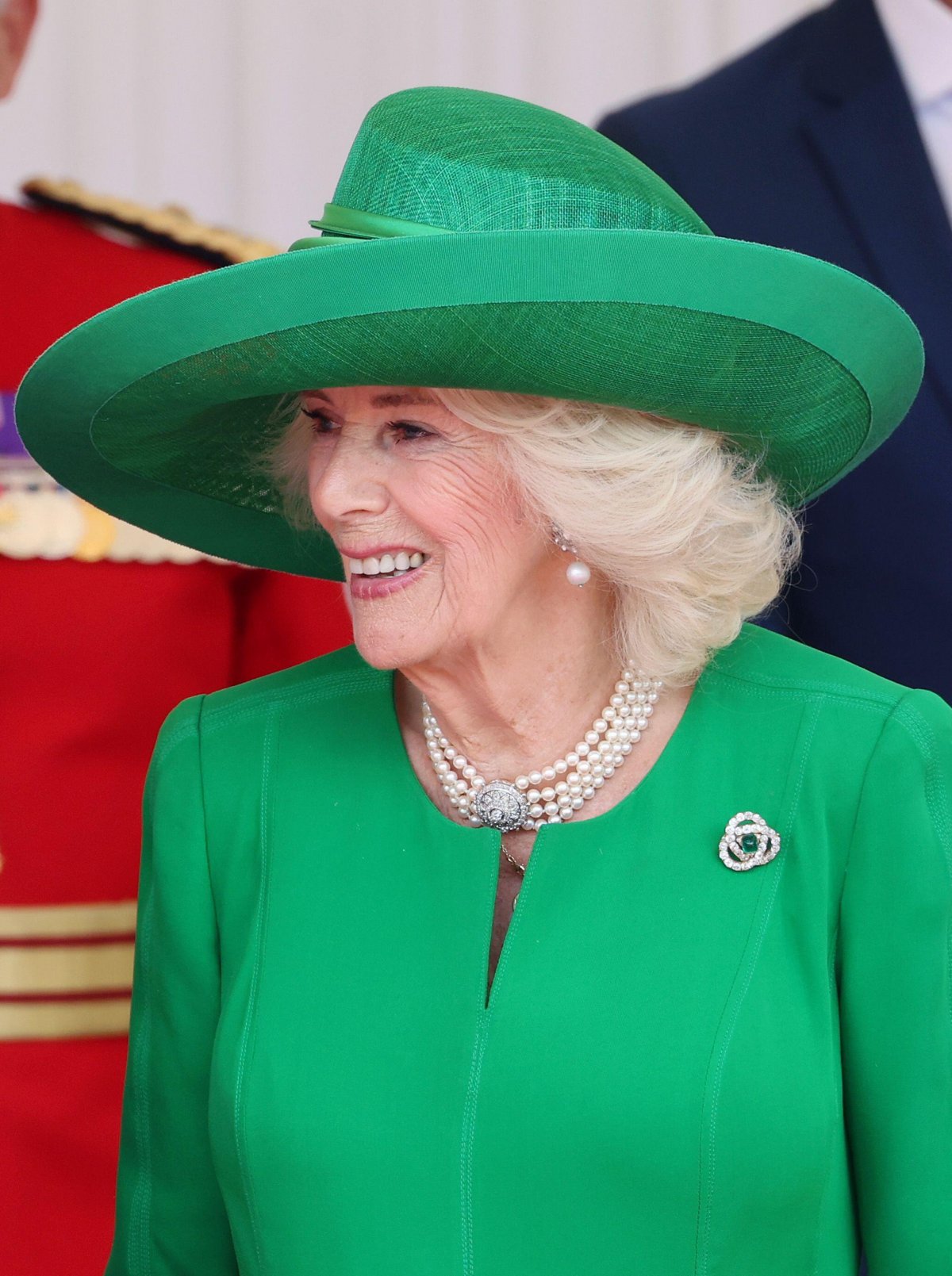 Queen Camilla has worn the green dress and the emerald knot brooch more than once for diplomatic events in recent months. She chose it for a reception at Villa Wolkonsky in Rome during the state visit to Italy in April.