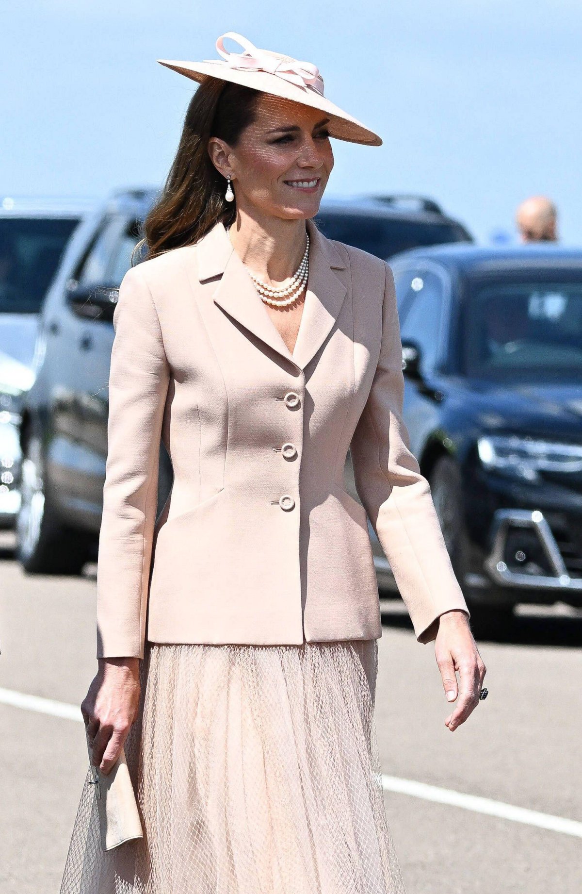 With the ensemble, she wore creamy pearls, including the classic Collingwood Pearl Drop Earrings that belonged to the late Diana, Princess of Wales. The three-row pearl necklace that Kate paired with the Dior jacket, per royal reporters, comes from the collection of Queen Elizabeth II.