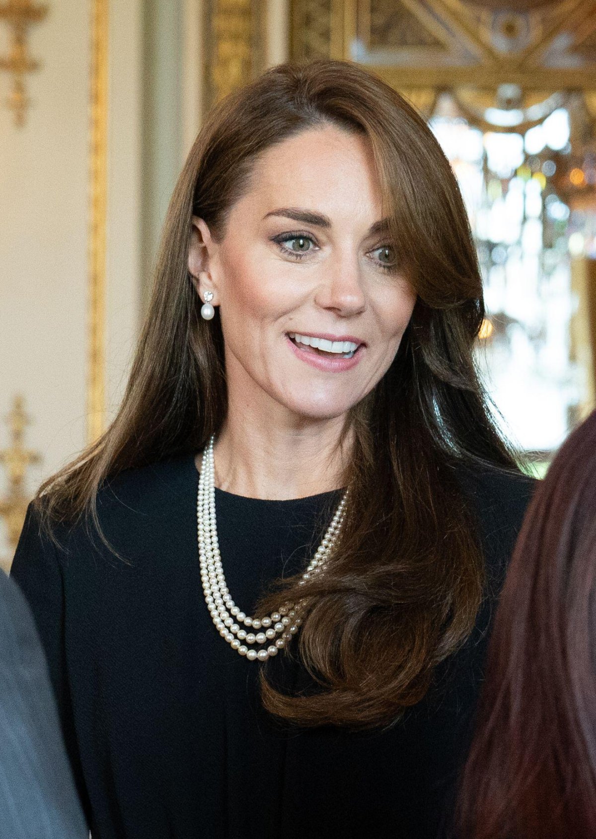 Shortly after Elizabeth II’s passing in September 2022, Kate wore another three-row pearl necklace, shown above, from the late monarch’s collection for a luncheon at Buckingham Palace. That necklace, though, is visibly longer. Either it’s the same necklace, which has since been shortened, or it’s a different piece altogether. I’d say either option is equally likely.