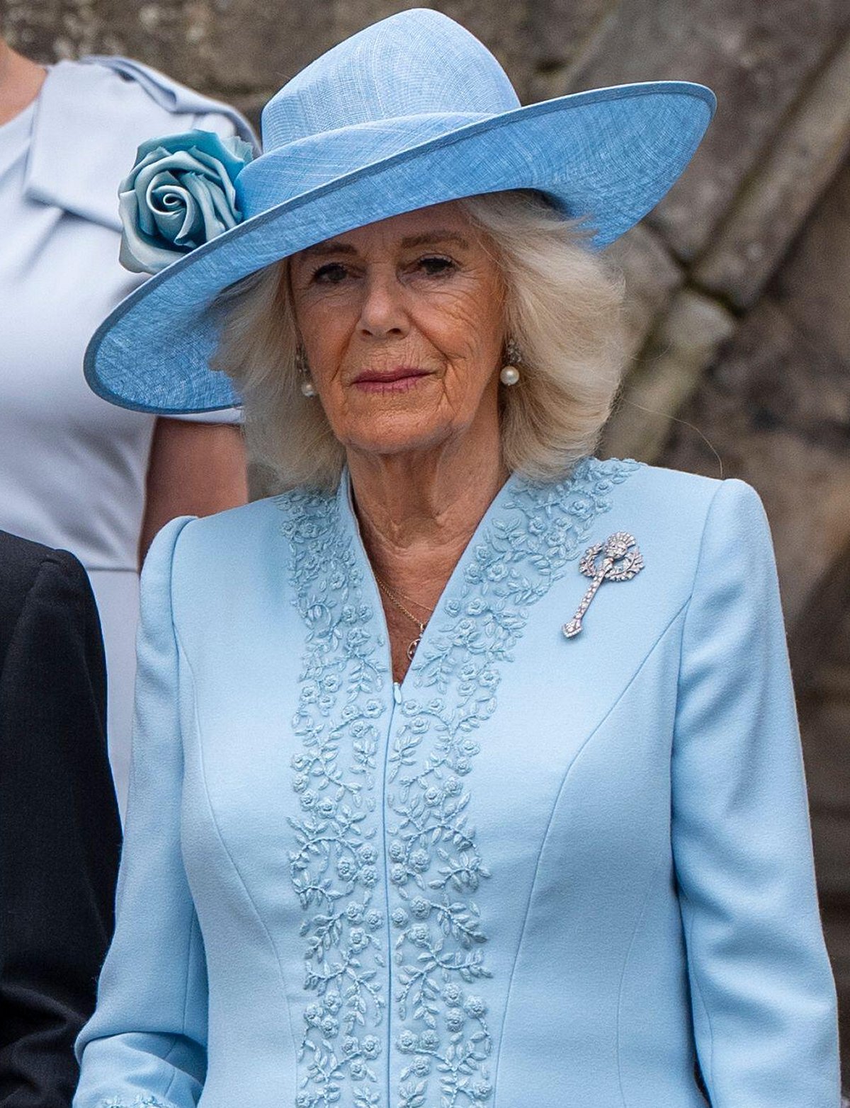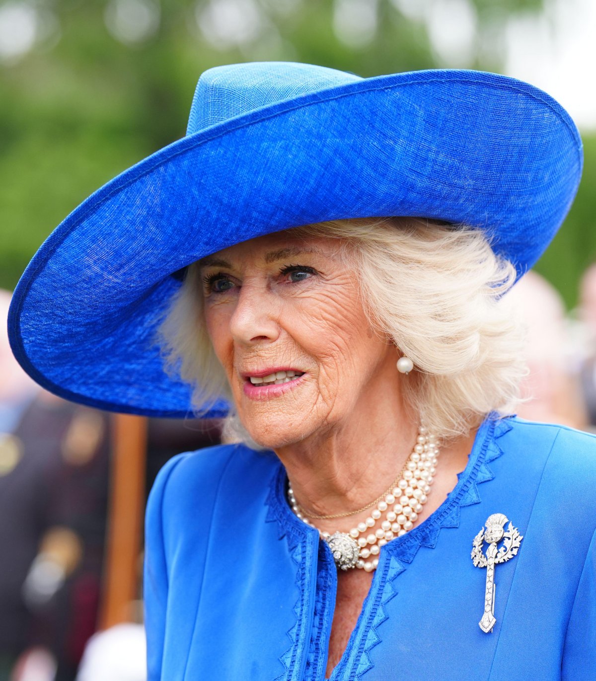 Queen Camilla’s jewelry was much more straightforward. She wore her favorite diamond and pearl drop earrings with her four-row pearl necklace with the round diamond clasp. On her jacket, she pinned a special heirloom piece: Queen Mary’s Diamond Thistle Brooch.