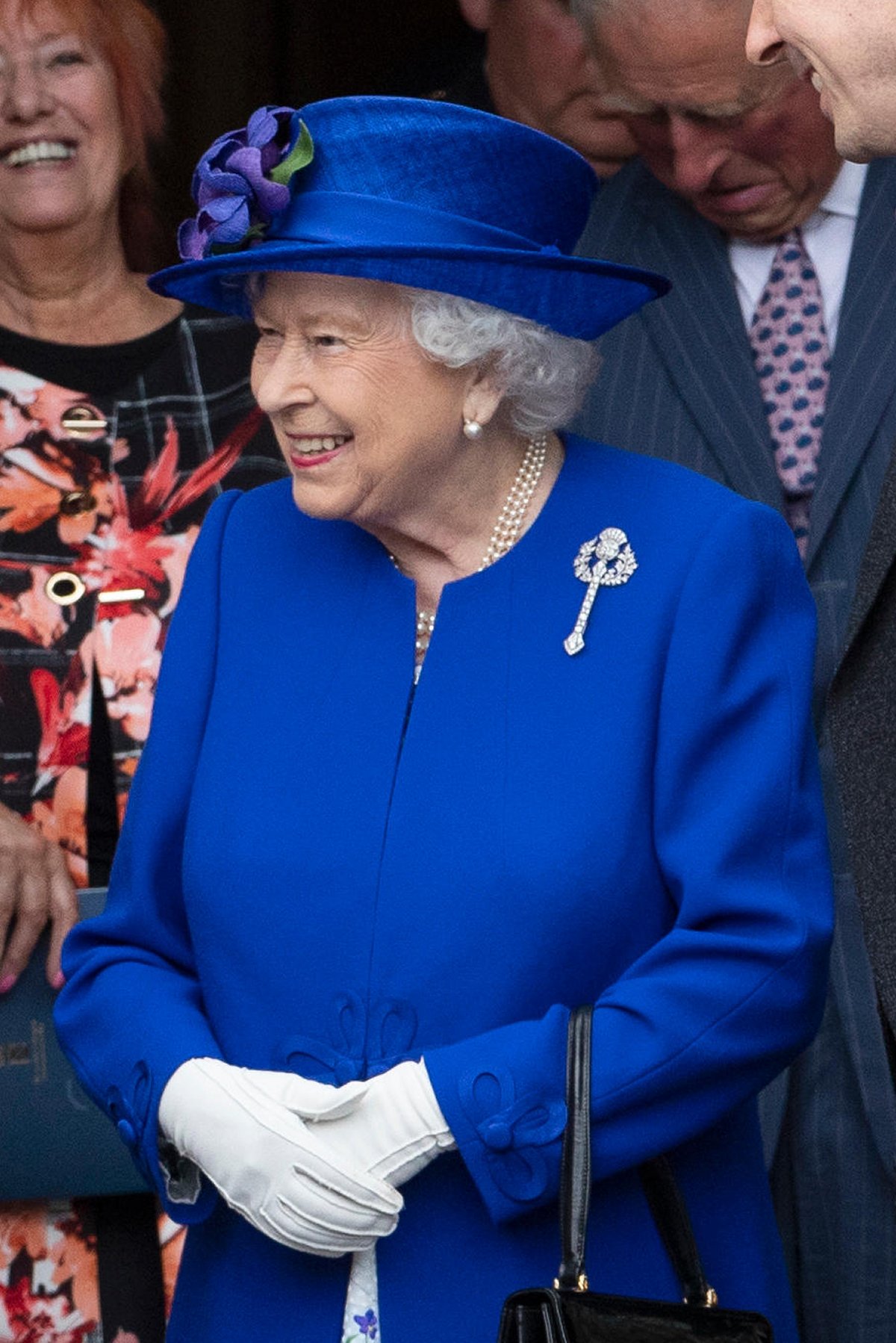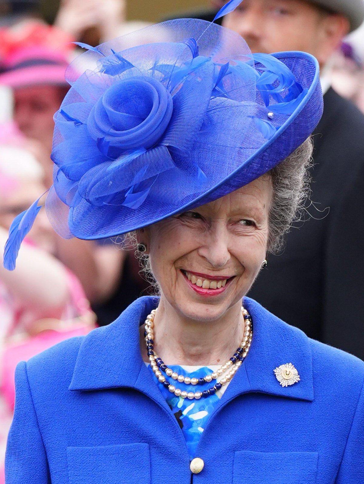 Princess Anne was elegant in a blue floral dress with a blue jacket and hat for the garden party. She accessorized with a necklace made of pearls and blue beads, diamond and sapphire cluster earrings, and another special pin with Scottish significance.