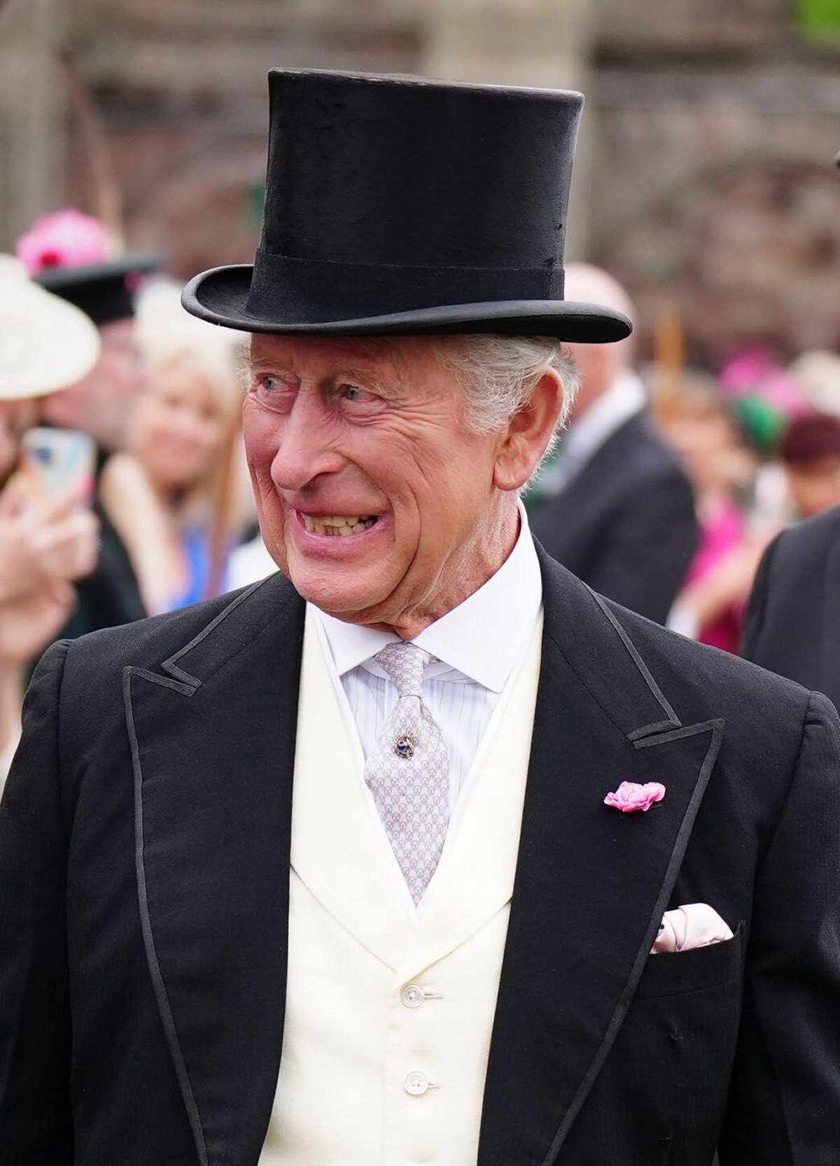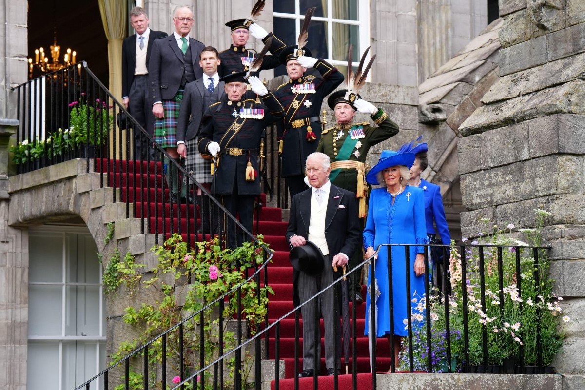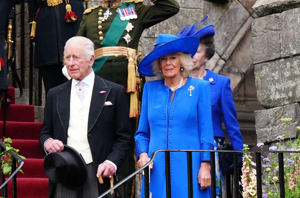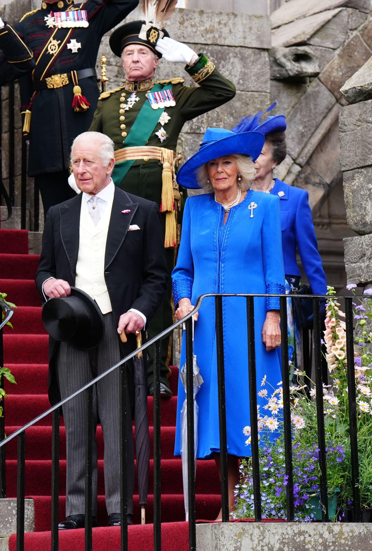 King Charles was dapper in a morning suit for the garden party, while both Queen Camilla and Princess Anne wore jackets and hats in bright, patriotic shades of Scottish blue.
