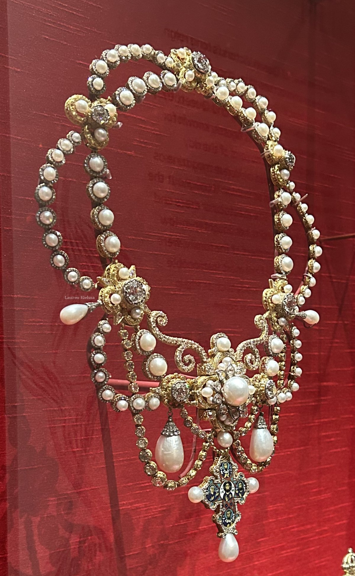 The other wearable jewelry pieces in Queen Alexandra’s display case are particularly special. This diamond and pearl necklace, and its matching earrings, were given to Alexandra as a wedding present by her new husband, the Prince of Wales (later Edward VII). They were part of a larger gift that also included a brooch (still with the royals today) and a tiara (no longer in the family collection). Alexandra wore the necklace, brooch, and earrings with her wedding gown in March 1863.