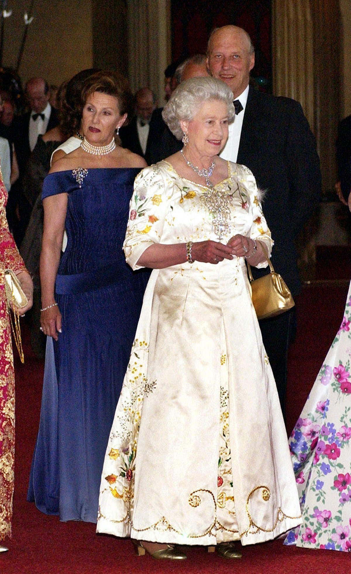 The stomacher was also given to the future Queen Elizabeth II by her grandmother as a wedding present in 1947. She wore it occasionally in its full setting—notably at the Golden Jubilee sovereigns’ dinner in 2002, pictured above—but also wore the separate sections as independent brooches.