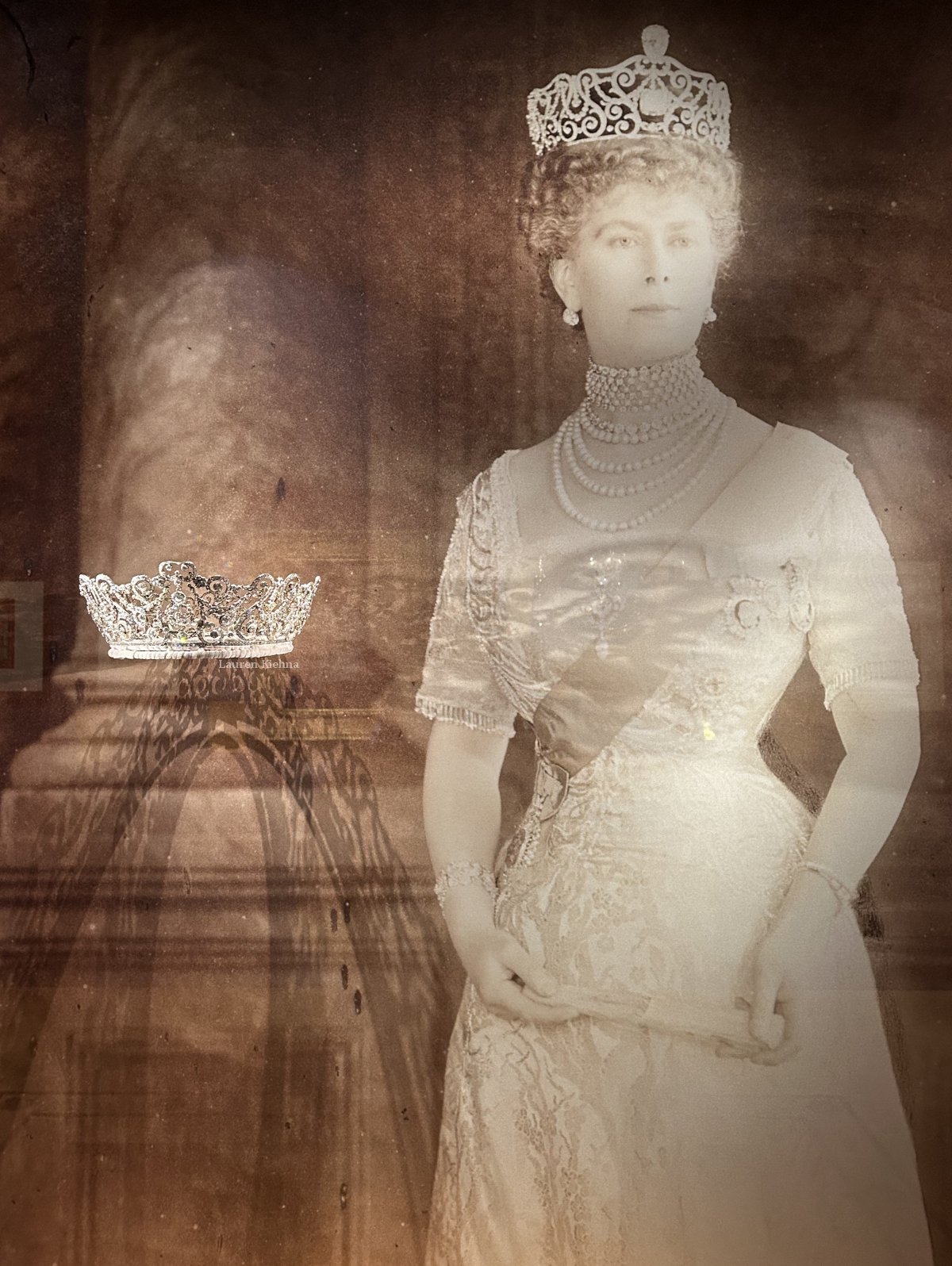 Here’s a good close-up of the tiara from the exhibition. Later in life, Queen Mary handed the tiara over to her daughter-in-law, Queen Elizabeth the Queen Mother. She wore it occasionally, notably for the opening of parliament in Cape Town during the 1947 tour of South Africa, and kept it in her jewelry box until her passing in 2002.