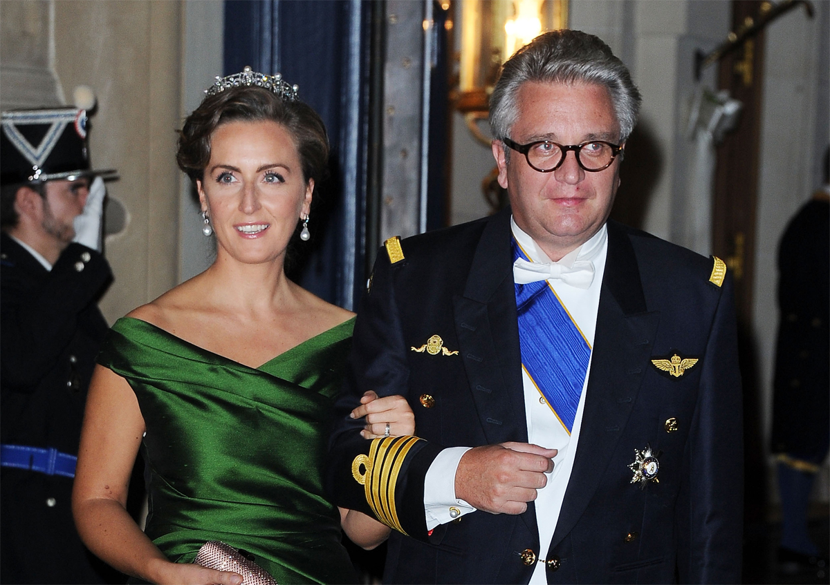 Princess Claire’s Wedding Tiara: A delicate tiara of diamonds, made of small diamond arches, larger diamonds set upright on spikes, and small diamonds set in a floral pattern near the base. Given as a wedding gift to Princess Claire by King Albert II and Queen Paola. Worn as a wedding tiara by Princess Claire.
