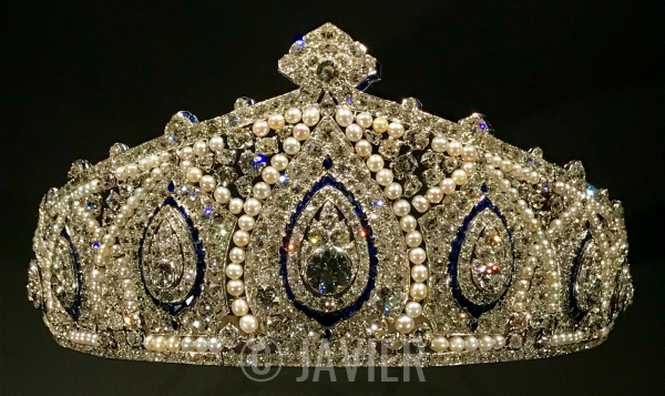 The Cartier Indian Tiara: A spectacular, complex, and densely-packed tiara set with diamonds, pearls, and sapphires, inspired by traditional Indian design motifs. Made at some time between 1906 and 1921 by Henri Lavabre at Cartier for Princess Marie Louise of Schleswig-Holstein. Bequeathed in 1956 to her godson, Prince Richard, Duke of Gloucester. Worn by Princess Marie Louise and the present Duchess of Gloucester.