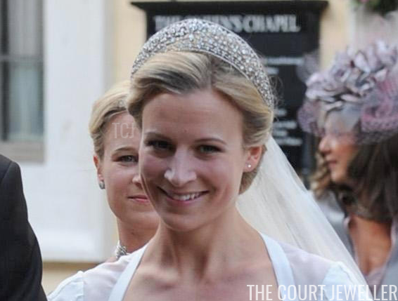 The Iveagh Tiara: A lacy diamond kokoshnik featuring delicate leaf designs. Presented to Queen Mary in 1893 as a wedding gift by Lord and Lady Iveagh. Bequeathed to Princess Alice, Duchess of Gloucester in 1953. Worn by Queen Mary, Princess Alice, Duchess of Gloucester, the present Duchess of Gloucester, and Lady Rose Gilman. Worn as a wedding tiara by Lady Rose Gilman (2008).