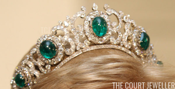 The Greek Emerald Parure Tiara: A kokoshnik-style diamond tiara, featuring the letter “E” prominently in its design, set with large diamond and emerald cabochon clusters. Convertible for wear as a necklace and accompanied by additional coordinating jewels to form a parure. Commissioned in the first half of the twentieth century by Queen Elisabeth, and made using jewels from Queen Olga’s collection. Worn by Queen Elisabeth, Queen Friederike, and Queen Anne-Marie.