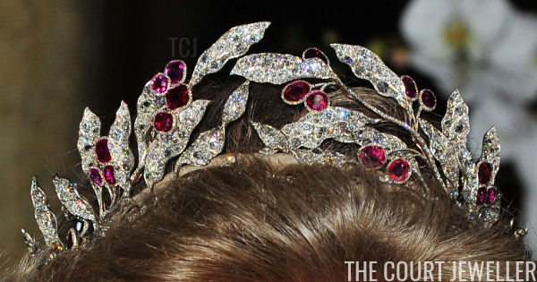 The Ruby Olive Wreath Tiara: A stylized tiara of diamond olive branches and ruby olives, accompanied by coordinating pieces to form a parure. Originally from the collection of Queen Olga, and then passed to Princess Nicholas and Princess Olga of Yugoslavia. Purchased by King Paul for Queen Friederike, and subsequently given to Queen Anne-Marie. Worn by Queen Olga, Princess Nicholas, Princess Olga of Yugoslavia, Princess Marina, Duchess of Kent, Queen Friedrike, and Queen Anne-Marie.