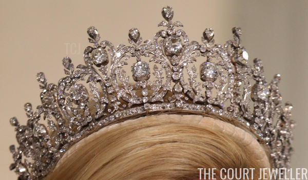 Princess Marie-Chantal’s Diamond Floral Tiara: A tiara featuring geometric floral designs rendered in diamonds. Likely loaned to Princess Marie-Chantal. Worn by Princess Marie-Chantal.