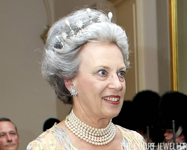Queen Sofia’s Star and Pearl Tiara: A delicate, unusual tiara featuring alternating diamond stars and upright pear-shaped pearl ornaments on a slender diamond festoon and floral base. Presented to Queen Sofia of Sweden as a wedding gift by her brother, the future Grand Duke Adolphe of Luxembourg, in 1857. Bequeathed in 1913 to Queen Victoria of Sweden, and inherited in 1930 by Queen Ingrid of Denmark. Inherited in 2000 by Princess Benedikte. Worn by Queen Sofia of Sweden, Queen Ingrid of Denmark, Princess Benedikte, Queen Anne-Marie of Greece, Princess Margaretha of Denmark, Princess Alexandra of Sayn-Wittgenstein-Berleburg, Princess Nathalie of Sayn-Wittgenstein-Berleburg, and Carina Axelsson.